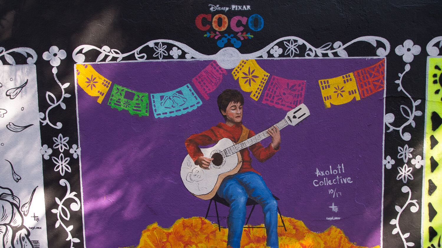 Sin dejar el humor que caracteriza a los mexicanos, los 30 murales realizados por artistas convocados por el Colectivo TUYI incorporan divertidas escenas de la película, en las que el pequeño Miguel acompañado de su inseparable amigo Dante, se aventuran en perseguir su corazonada y pasión por la música hasta encontrarse en el mundo de los difuntos, en donde descubren la alegría que los acompaña tras la muerte.