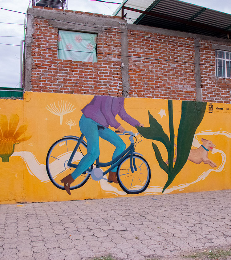 Mithhu, artista invitada, pintó el mural “Rueda tras rueda” que retrata los días de la señora Carmen, una ciclista, quien junto a su nieta –que va en patineta– salen a disfrutar de la naturaleza y de la compañía de sus perros.