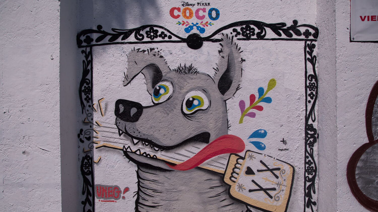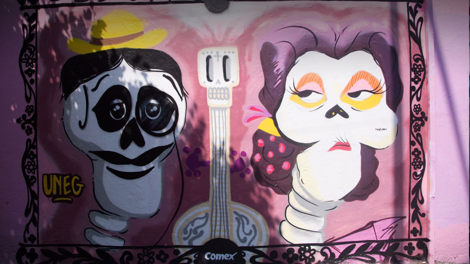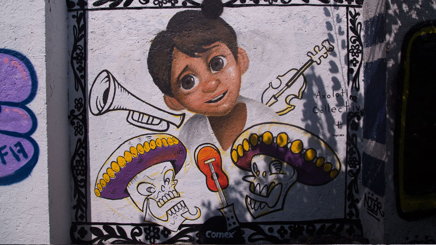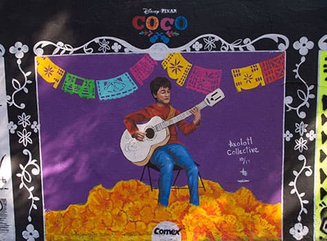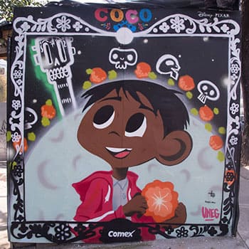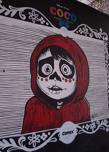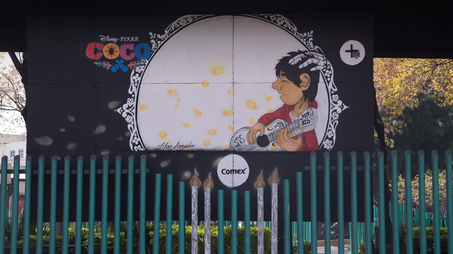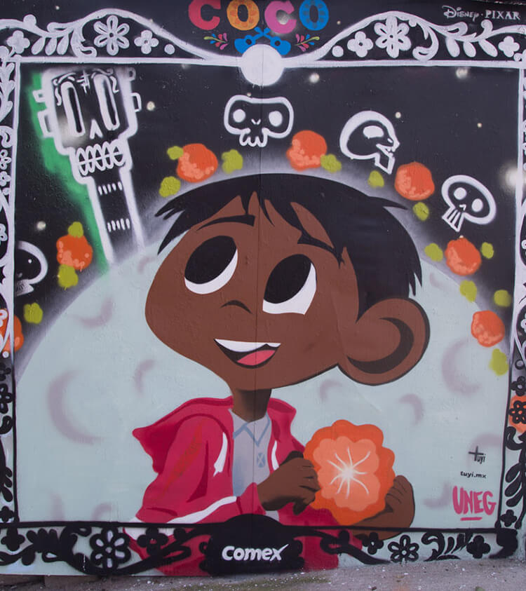 Sin dejar el humor que caracteriza a los mexicanos, los 30 murales realizados por artistas convocados por el Colectivo TUYI incorporan divertidas escenas de la película, en las que el pequeño Miguel acompañado de su inseparable amigo Dante, se aventuran en perseguir su corazonada y pasión por la música hasta encontrarse en el mundo de los difuntos, en donde descubren la alegría que los acompaña tras la muerte.