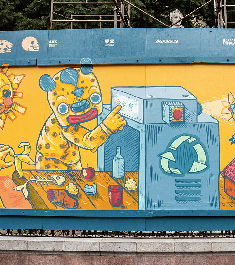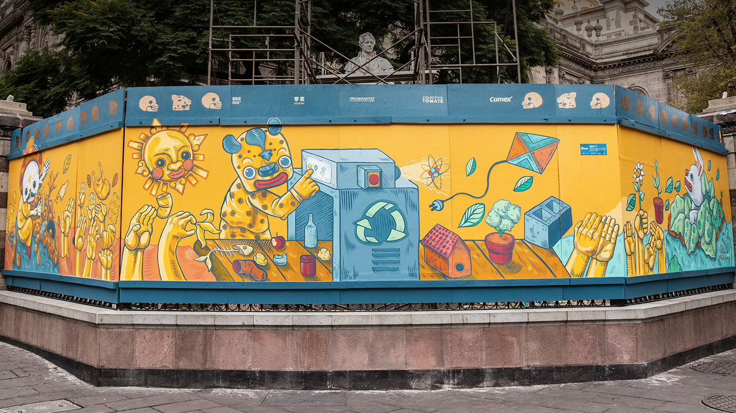 Para el Día Mundial del Hábitat se convocó a Dherzu para diseñar ‘Reverdeciendo’, un mural con el propósito de reflexionar acerca de las tecnologías de vanguardia como herramienta innovadora para transformar los residuos en riqueza.